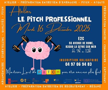 LE MARDI 16 DECEMBRE 2025 - DE 9H00 à 12H00 - ATELIER "PITCH PROFESSIONNEL" - LIEU: E2C 55 avenue de Rome 83500 LA SEYNE SUR MER - INSCRIPTION OBLIGATOIRE: 04 97 06 94 83